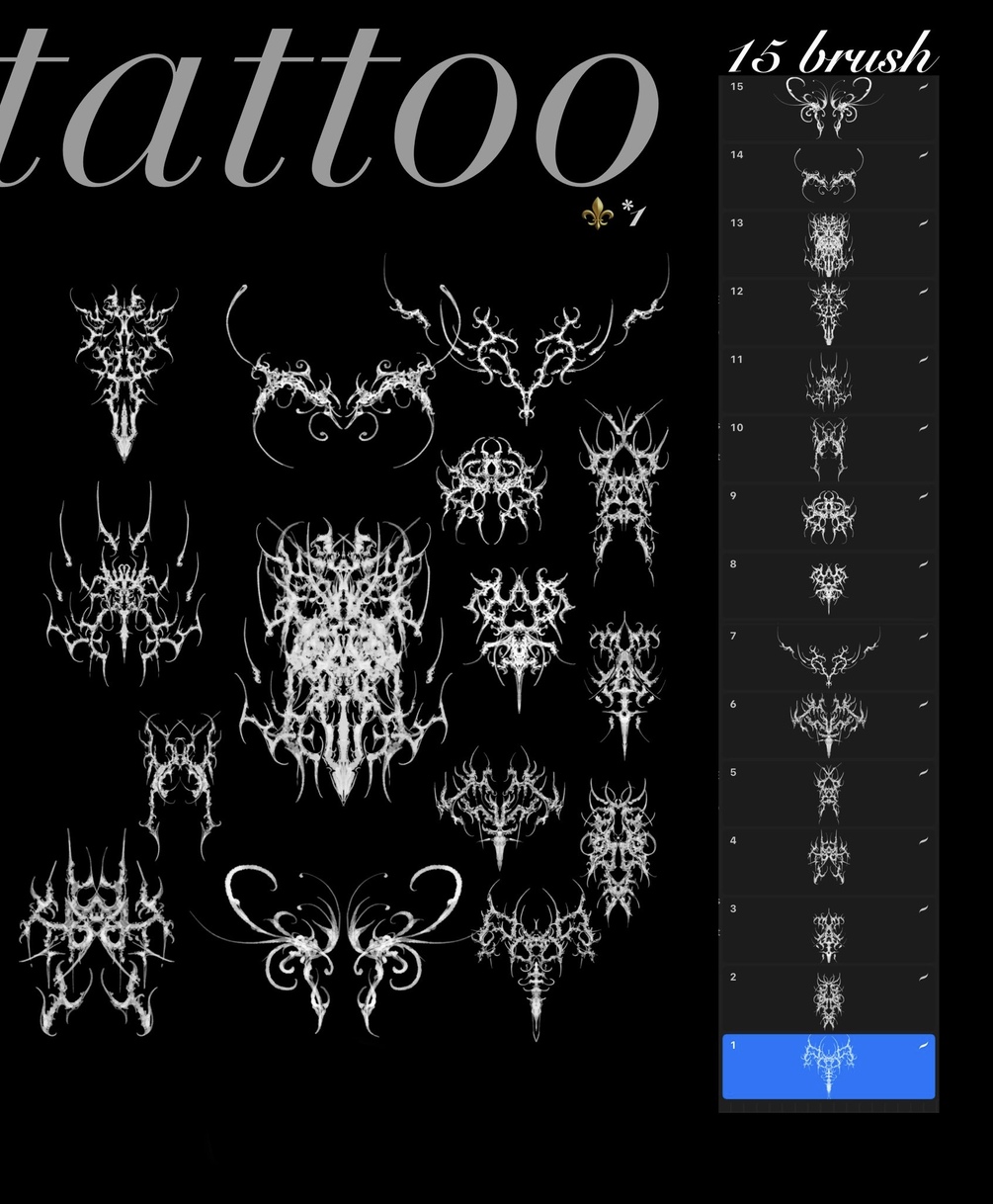 Product Name: Ritual Ink – 15 Gothic Metal Tattoo Brushes • Concept: Tattoo-inspired brushes in a dark, metal, gothic style • License: Commercial use allowed (excluding use for real-life tattooing)
